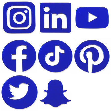Set of 8 social media icons in mirror blue acrylic. Self-adhesive backing for easy adhesive to smooth flat surfaces. Premium mirrored acrylic is made in the USA, with the icons all cut in our UK studio. Set includes Instagram, LinkedIn, YouTube, Facebook, TikTok, Pinterest, Twitter and Snapchat.