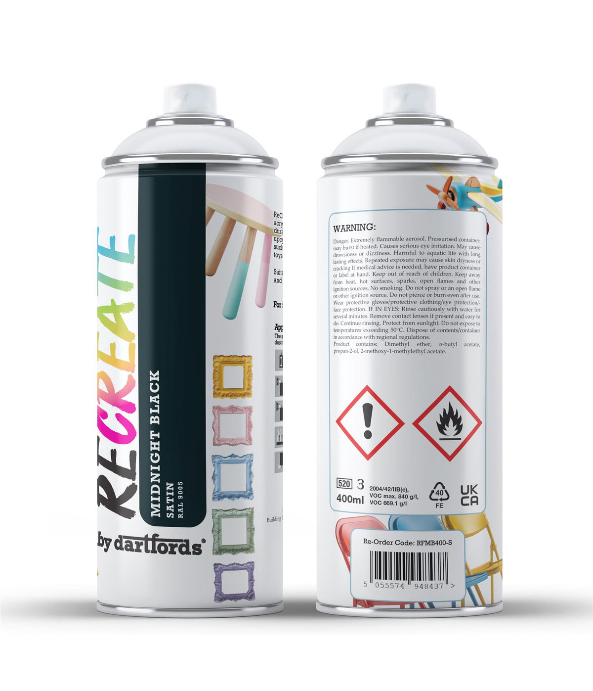 RECREATE Midnight Black Satin Spray Paint for Wood, Metal, Plastic | Quick Drying, Smooth, Durable, Easy-to-Apply | Suitable for Indoor / Outdoor | For Furniture, Craft, Doors, Ornaments, Pots, Frames
