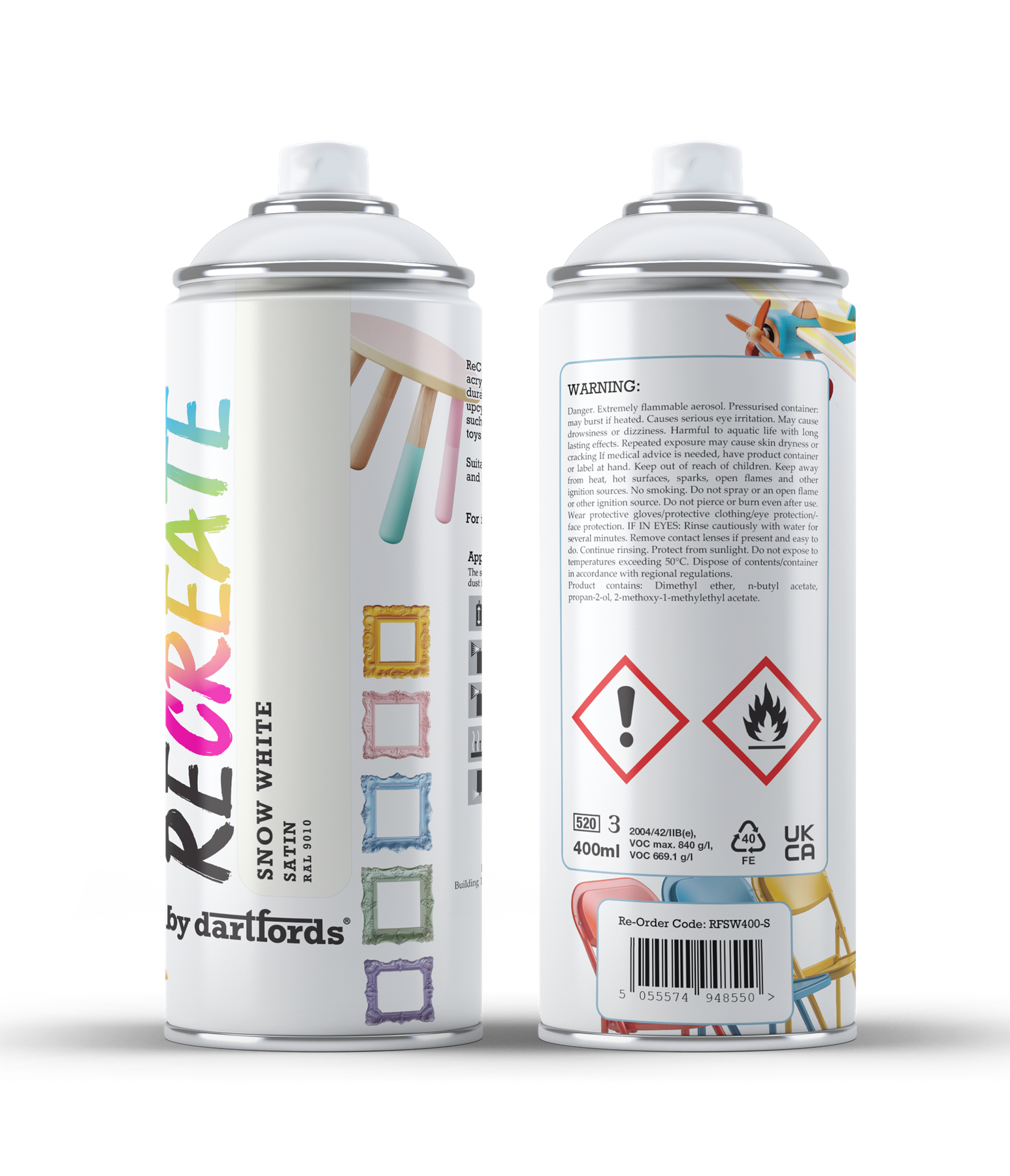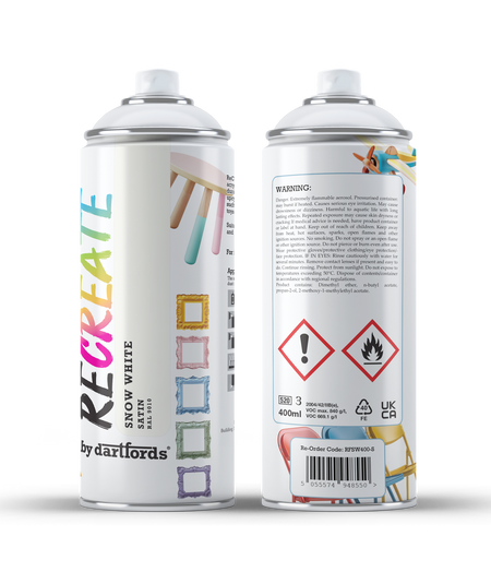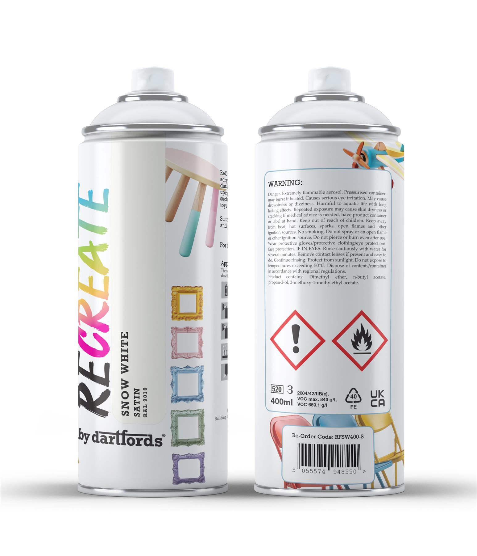 RECREATE Snow White Satin Spray Paint for Wood, Metal, Plastic | Quick Drying, Smooth, Durable, Easy-to-Apply | Suitable for Indoor / Outdoor | For Furniture, Craft, Doors, Ornaments, Pots, Frames