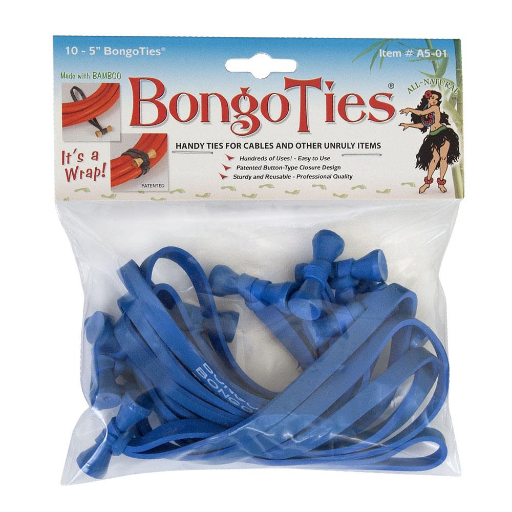 Pack of 10 BongoTies, each 5" (about 125mm) long. Hundreds of uses in the home, office, stage and workshop, handy for cables and other unruly items. Patended button-type closure design with flared ends to ensure a secure tie. Sturdy and reusable, originally designed for professional use in the film industry. All blue with bamboo ends and premium quality elastic, made in USA.