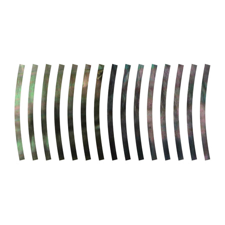 Pack of 15 purfling strips, each measuring 25.4mm (1in ) long, with an inside diameter of 120mm. Curved strips for inlaying an acoustic guitar rosette - one pack of 15 strips will make a complete ring. Strips are 1.6mm wide, and 1.3mm deep. Mother of pearl strips adhere with superglue or clear epoxy. CNC machined strips ensure consistency and precision, with all pieces made from 3A grade shell material.