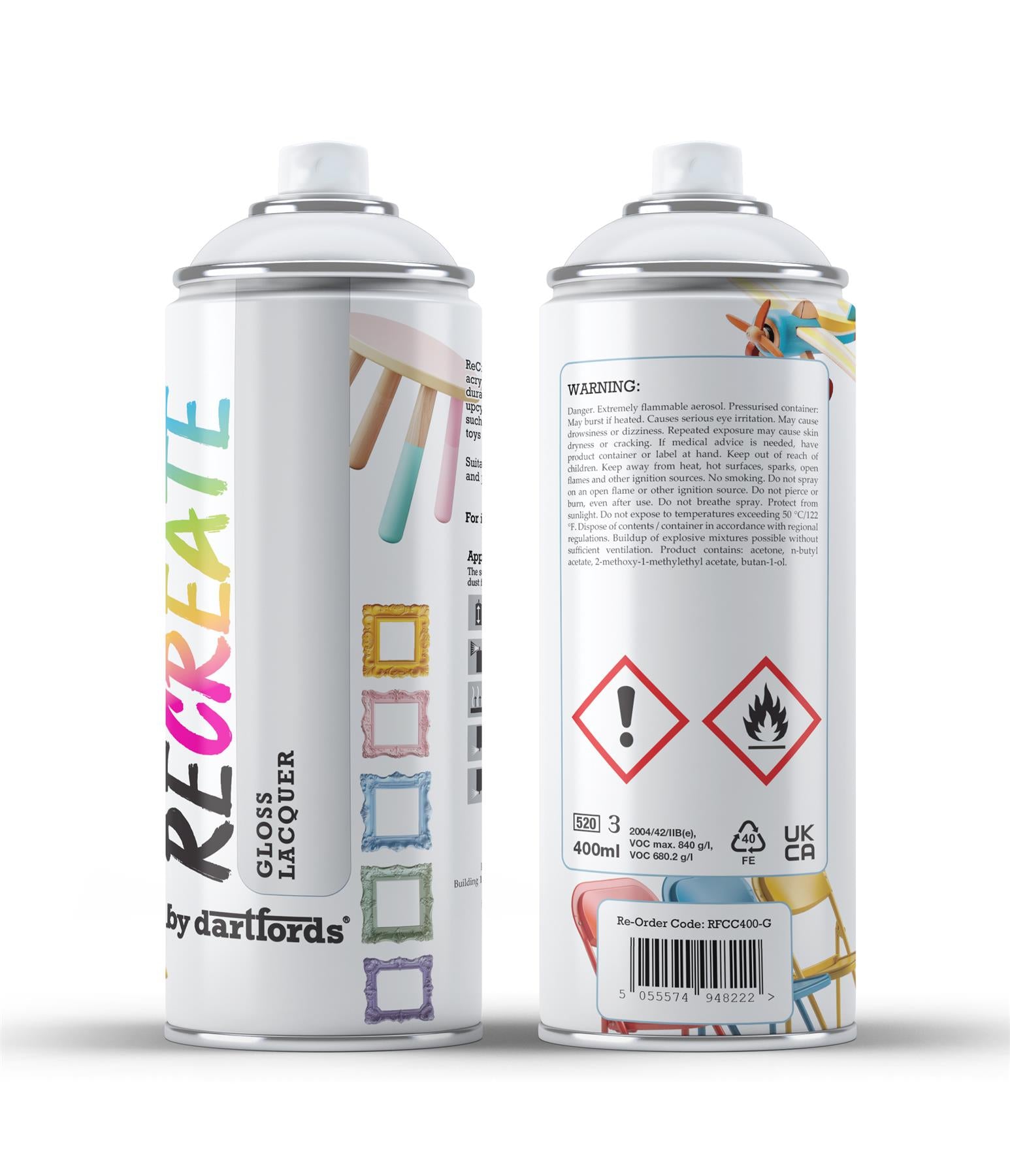 RECREATE Clear Gloss Spray Varnish Lacquer for Wood, Metal, Plastic | Quick Drying, Smooth, Durable, Easy-to-Apply, Multi-Surface Spray Varnish | Suitable for Indoor / Outdoor | For Furniture, Craft, Doors, Ornaments, Pots, Frames