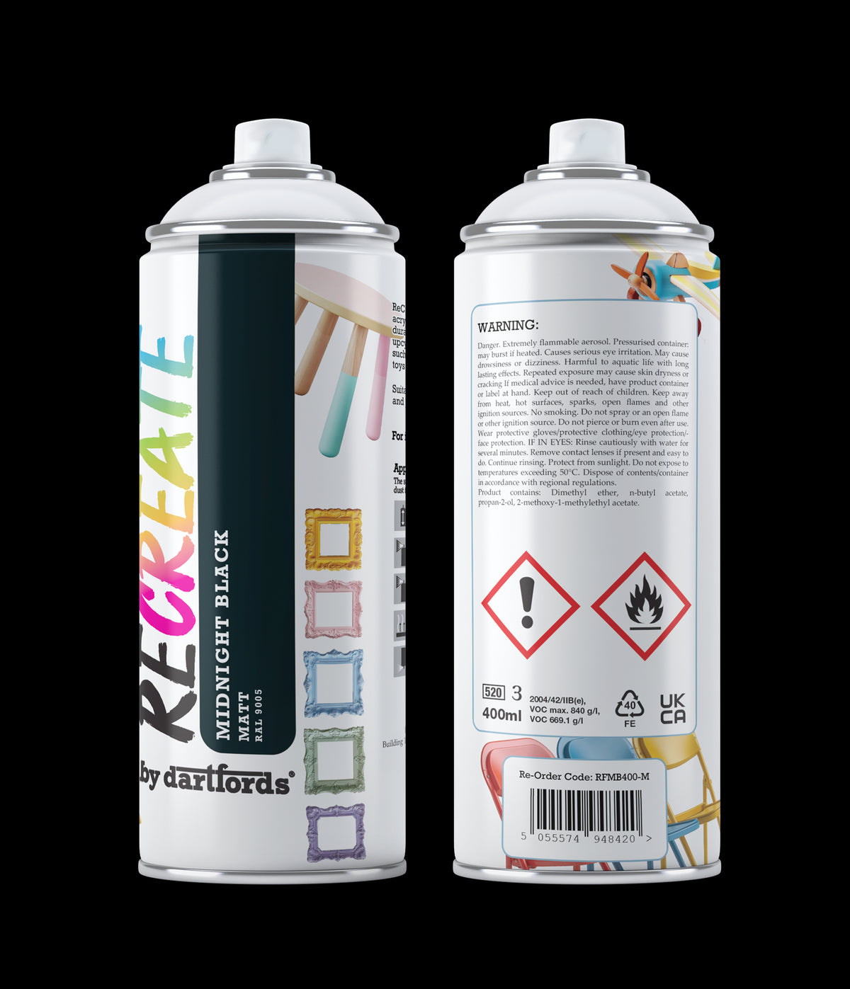 Recreate Midnight Black Matt Interior/Exterior Spray Paint For Wood, Metal and Plastic - 400ml Aerosol